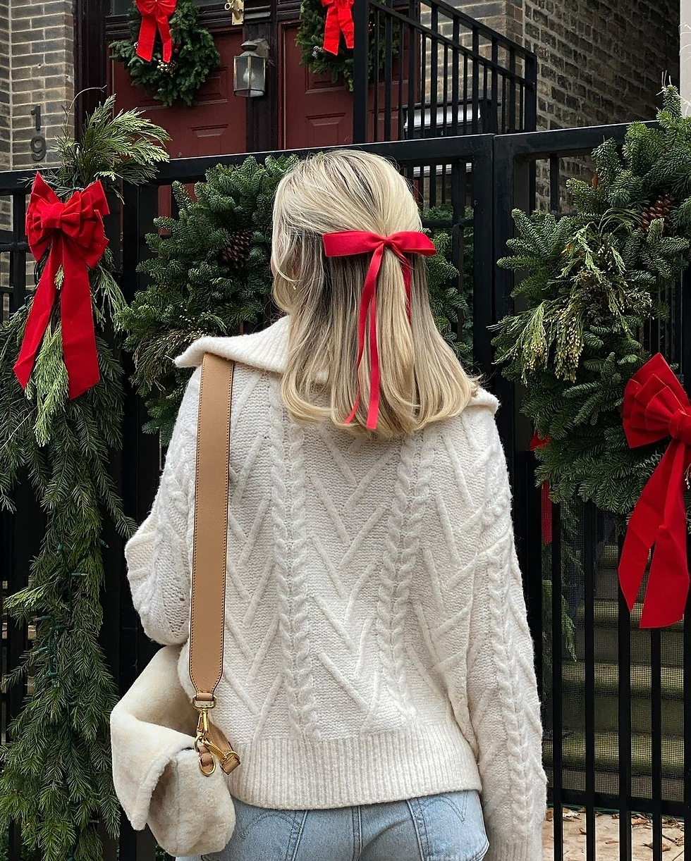 Soft white or cream knits feel snowy, cozy, and festive without being over the top. A chunky sweater or cardigan instantly makes an outfit feel wintery and Christmas ready, especially when paired with gold jewelry or any pop of holiday color.